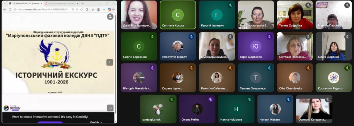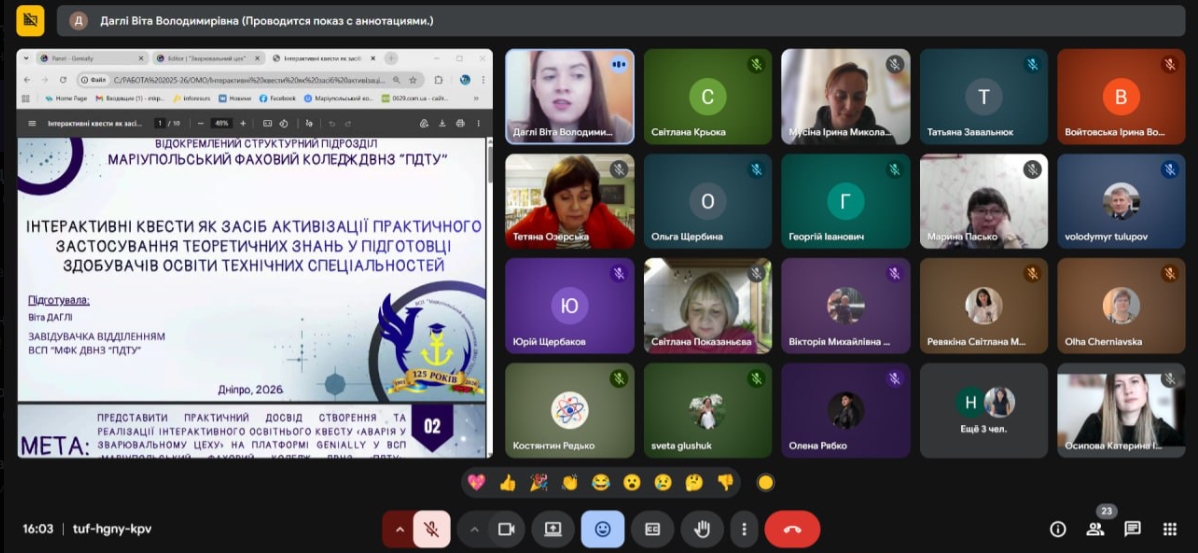 Завідувачка відділенням Даглі В.В. провела захопливий історичний екскурс від заснування до сьогодення коледжу, пригадавши всі визначні події та здобутки на цьому шляху. Окрім того, вона поділилася цінним досвідом створення квест-гри «Аварія у зварювальному виробництві» на платформі Genially — інтерактивного інструменту, який робить навчання цікавим та максимально наближеним до реальних виробничих ситуацій.