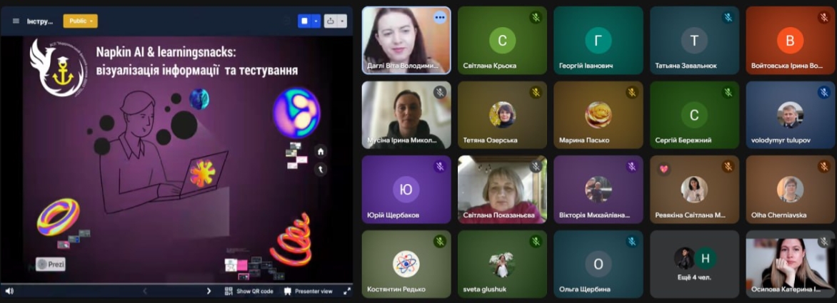 Викладач Мусіна І.М. представила свій авторський підхід до сучасної освіти з використанням цифрових інструментів — Napkin AI & LearningSnacks, продемонструвавши, як технології допомагають зробити навчальний процес більш ефективним, наочним та цікавим для студентів. Також Ірина Миколаївна поділилася особистим досвідом професійного зростання — у цьому році вона успішно пройшла позачергову атестацію на здобуття кваліфікаційної категорії «спеціаліст вищої категорії».