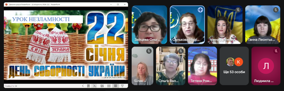 22 січня 2026 року відбувся черговий урок незламності «Україна соборна та неподільна» у дистанційному форматі. Захід став продовженням серії загальнообласних освітніх ініціатив, які протягом 2025/2026 навчального року проводяться для здобувачів освіти закладів загальної середньої, позашкільної, професійної (професійно-технічної), фахової передвищої та вищої освіти за підтримки департаменту освіти і науки Донецької обласної державної адміністрації.